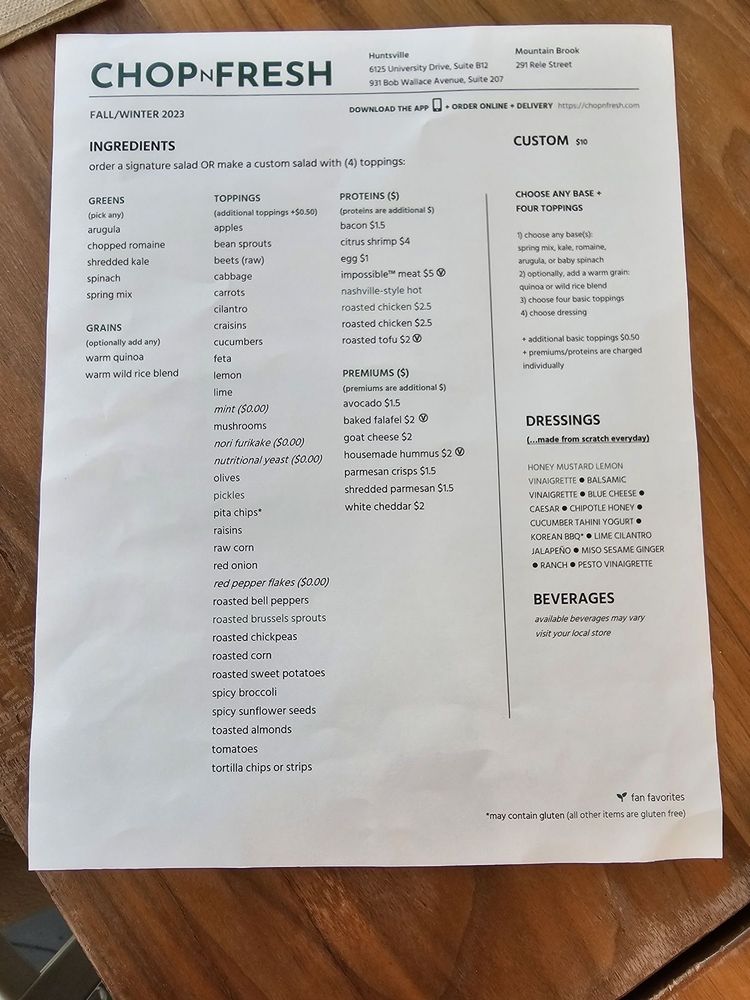 Welcome to CHOP N FRESH, a vibrant new American vegetarian eatery located in Mountain Brook, AL. Specializing in fresh and customizable salads, this women-owned gem invites guests to indulge in a variety of seasonal and signature dishes. Each salad is crafted with care, featuring premium ingredients like citrus-marinated shrimp, roasted salmon, and spicy sunflower seeds.